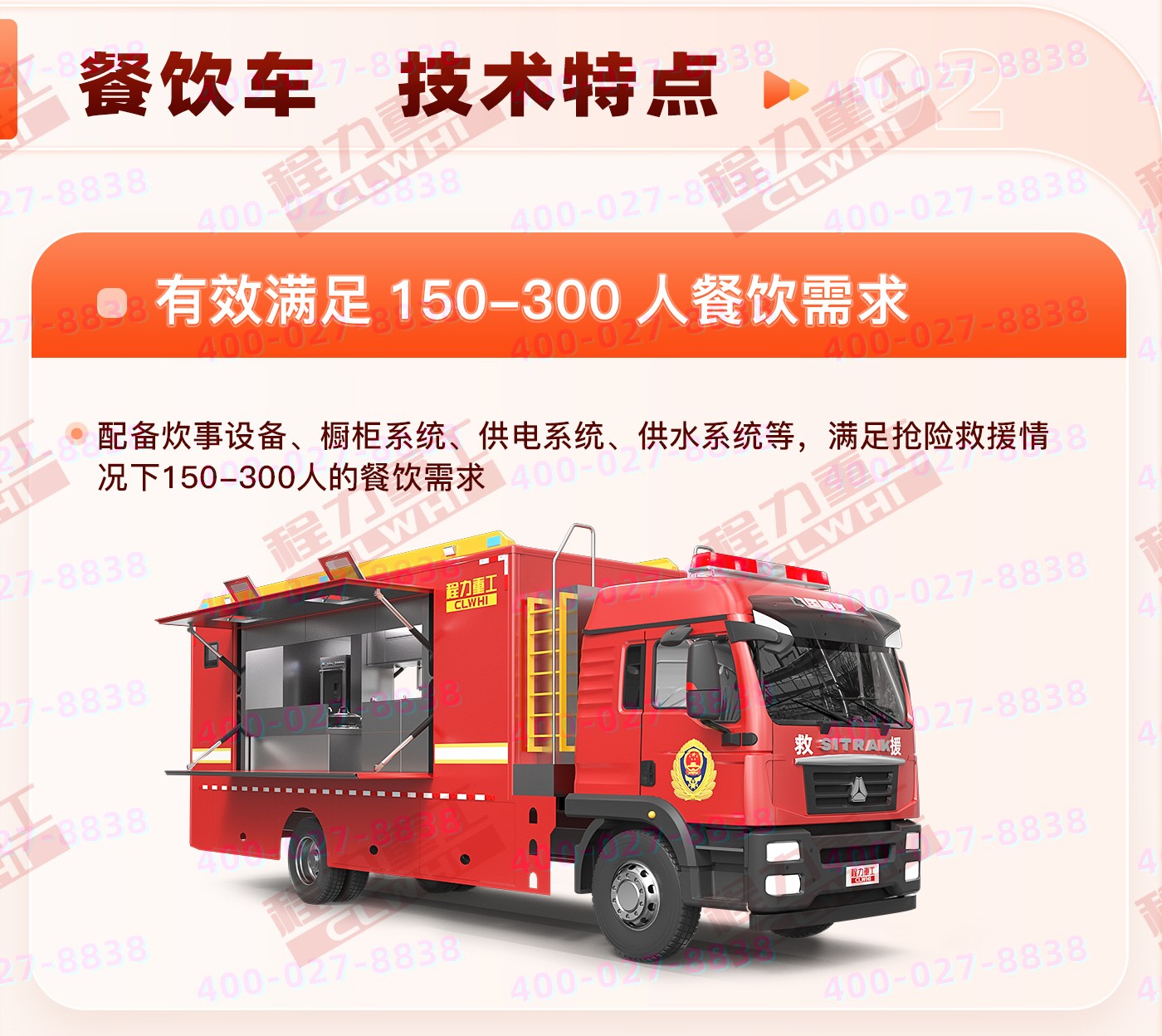 重汽HOWO炊事車:中國重型汽車集團原廠重汽豪沃6*6越野底盤,三軸5200+1400mm軸距,9726ML排量,280馬力。